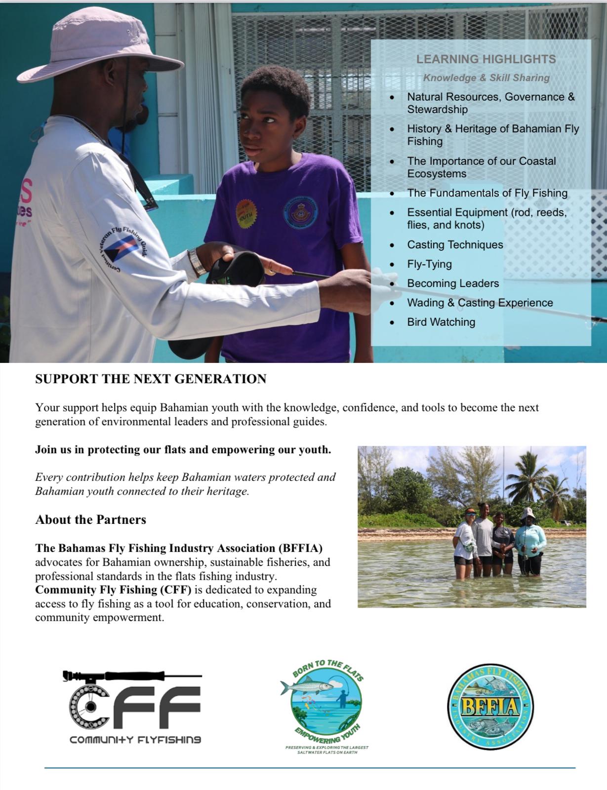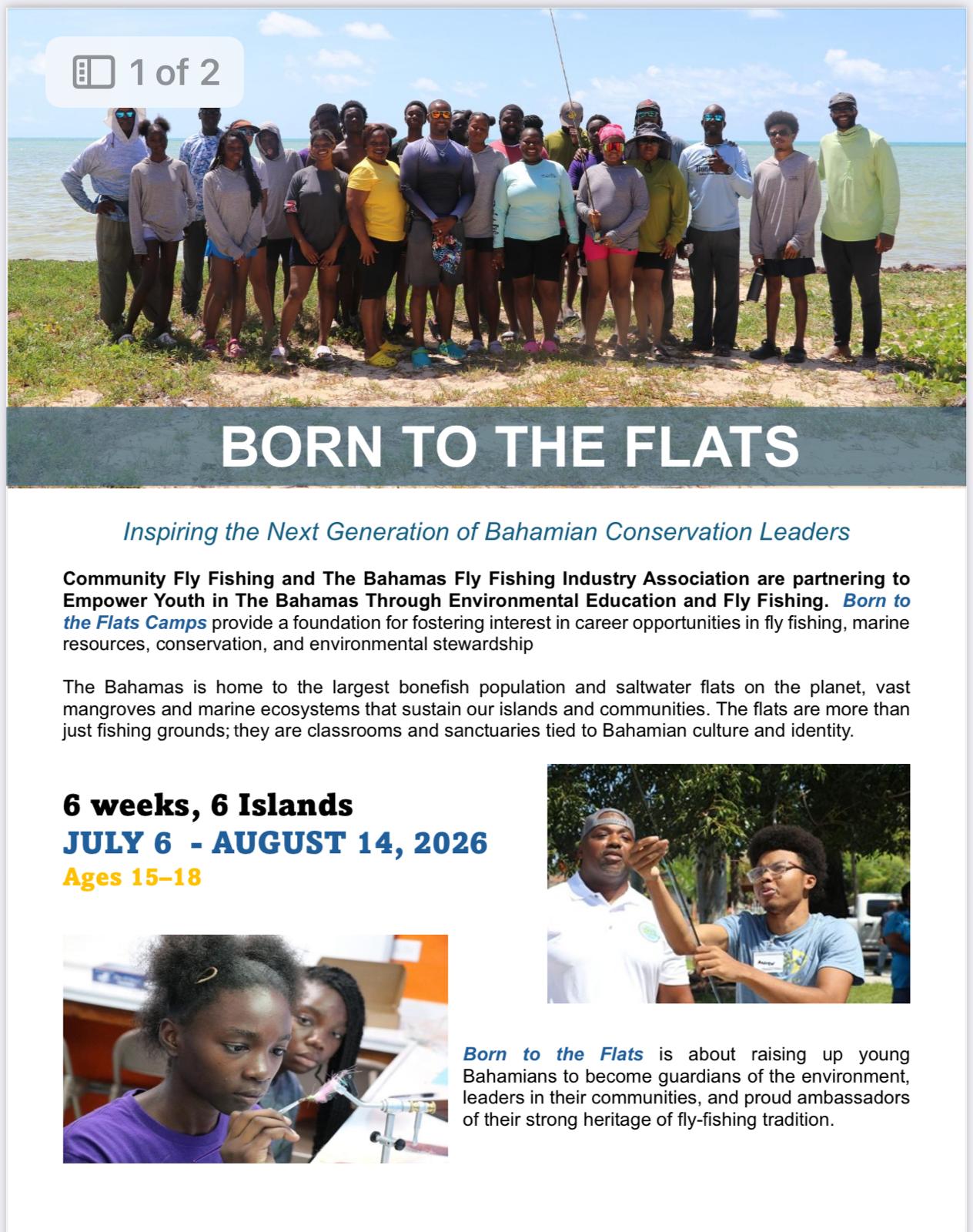 Inspiring the next generation of Bahamian Conservation Leaders Community Fly Fishing and the Bahamas Fly Fishing Industry Association are partnering to Empower Youth in the Bahamas Through Environmental Education and Fly Fishing. Born to the Flats Camps provide a foundation for fostering interest in career opportunities in fly fishing, marine resources, conservation, and environmental stewardship.The Bahamas is home to the largest bonefish population and saltwater flats on the planet, bast mangroves and marine ecosystems that sustain our islands and communities. The flats are more than just fishing grounds; they are classrooms and sanctuaries tied to the Bahamain culture and identity.